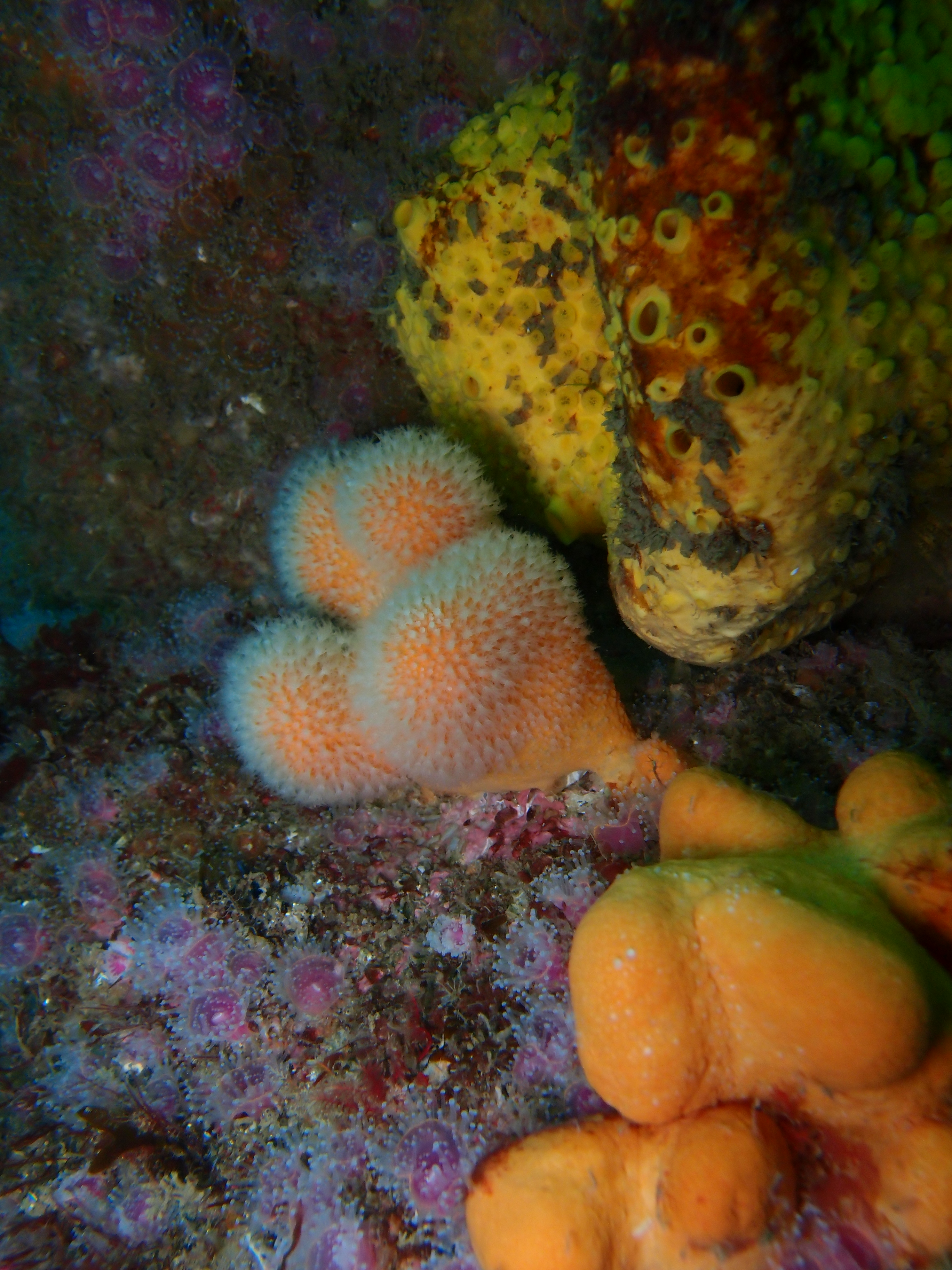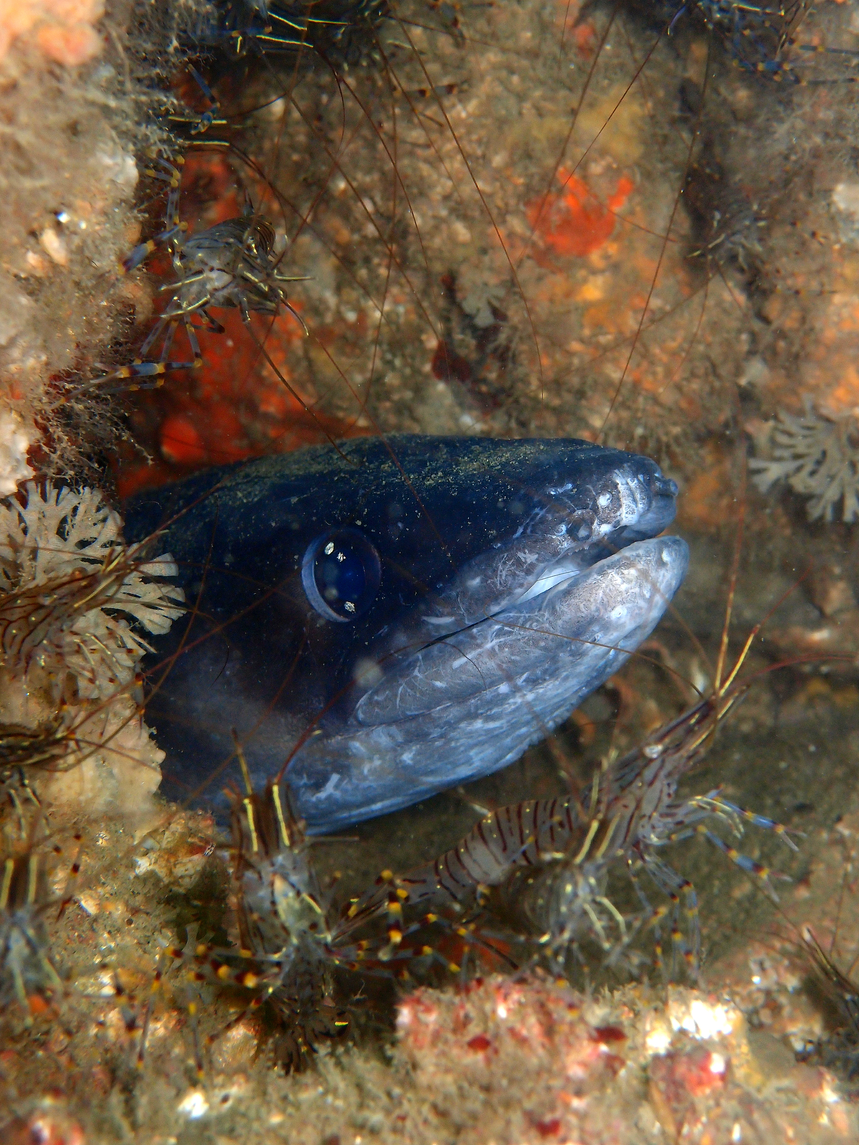 Congre entouré de « ses » crevettes Alcyons (orange), éponge (jaune) et anémones (violettes)