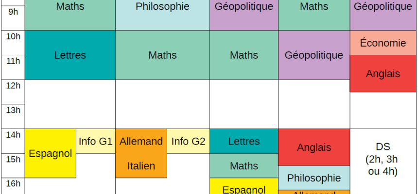 L’emploi du temps hebdomadaire compte 29 heures de cours, agrémentées de 2 ou 3 heures de « colles » (interrogation orales personnalisées) selon les semaines.